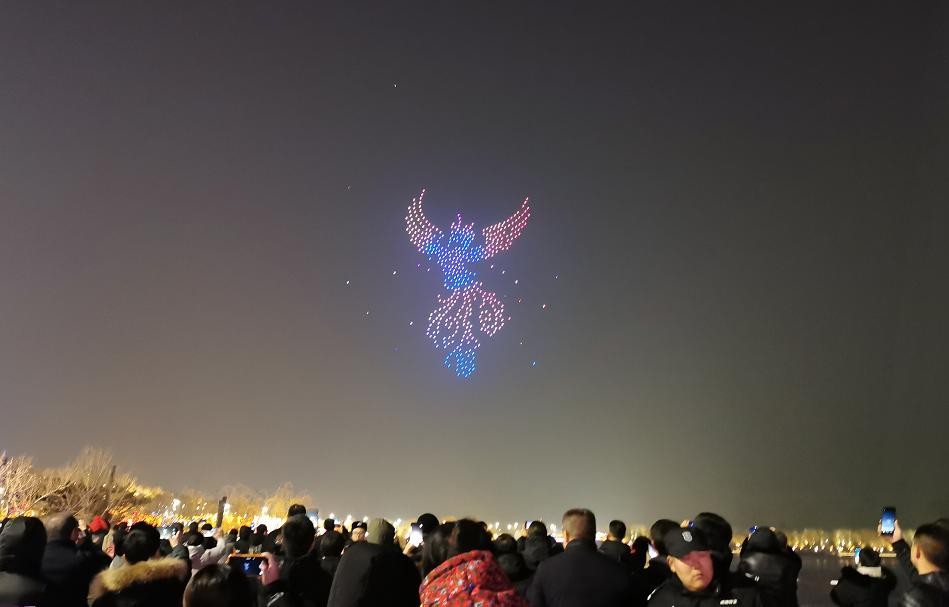 开幕当晚,万千游客汇聚龙泉湾畔,500架无人机云集龙泉湾上空,将灯光从陆地、湖面延伸到空中,在夜幕的衬托下,通过数字化编队和挂载灯光变化出“凤凰展翅”“贴窗花”“来南湖过大年”等奇妙的图案和文字,为游客献上了一场极具视觉冲击力的“水陆空”视觉盛宴。
