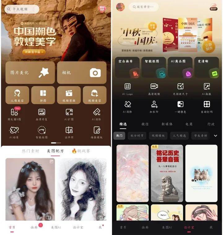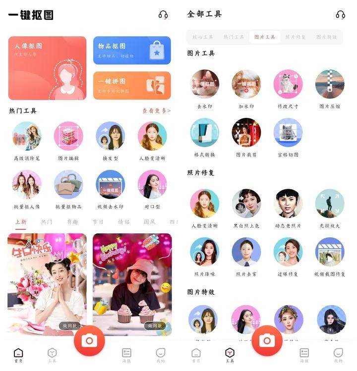 一个比较被人们熟知的图片编辑软件,支持图片美化、模板、人像美容、拼图,同时还支持画质修复、证件照、视频剪辑、视频美容美等功能,操作也比较简单