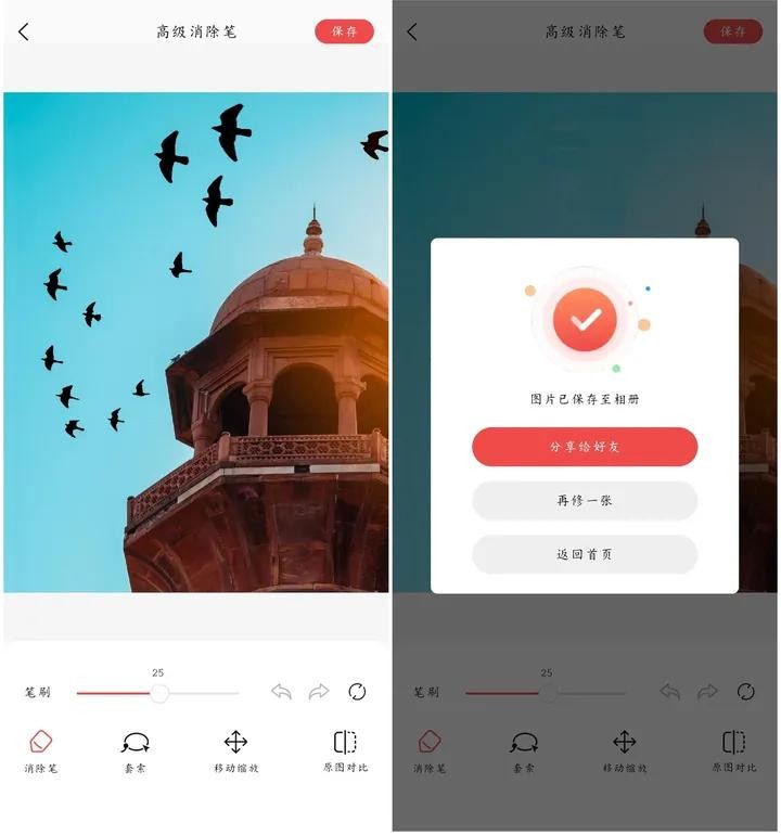 打开软件,选择首页的【高级消除笔】,上传图片,在消除笔上选择大小合适的笔刷,对图片上需要消除的地方小心覆盖,之后软件会自动将涂鸦去掉,最后点击保存就能将图片下载到手机里