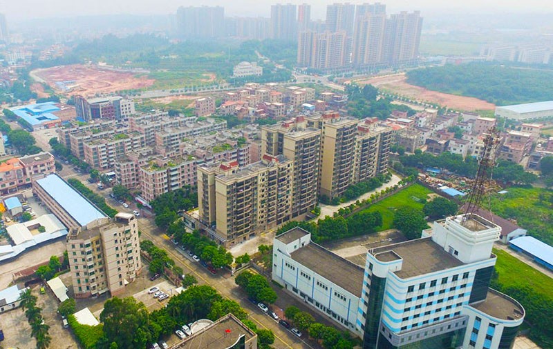 从镇政府上空往周边看过去,丹灶水网纵横,阡陌交通。乍看之下,很难想象这样一个镇,竟然也是2015年中国百强镇中的一员。图为丹灶镇政府周边航拍。(来源:大粤网)