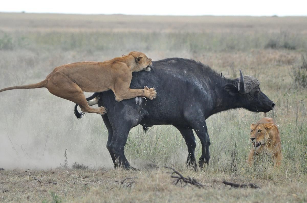 由于猎物特性的缘故,狮子在捕猎时,往往不能对猎物一击致命,所以它们更注重伤害,让猎物慢下来、弱下来,然后才是锁喉。