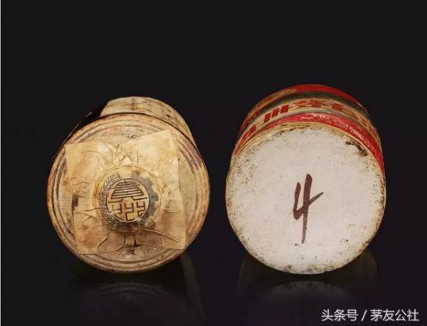 60年代早期的土陶瓶,仍然在沿用软木塞加猪尿泡皮密封,外用纸封口。但是到了中期,陶瓷瓶装茅台酒出现后,瓶盖就换成了软木塞加红色酒精膜包裹以及软木塞加红色胶帽包裹。