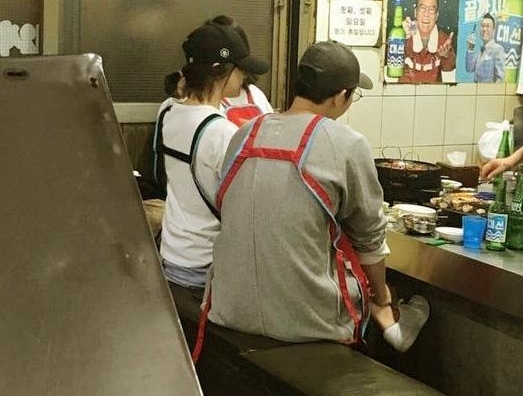 宋慧乔和宋仲基的背影感觉好美啊!不知道是不是在韩国街边逛累了还是肚子饿了,双宋在小吃店驻足品尝美味,虽然看不清是什么美食,但是依双宋的品味来看应该十分香甜可口。只不过这吃个小吃也挺讲究的,双宋套上围裙也如此同步,不过宋仲基挂着围裙挺有趣的,话说宋欧巴不是喜欢黑色调吗?怎么选了一个鲜红的围裙样式呢?这对甜蜜的夫妻一同望向眼前制作的美食,宋欧巴更是把头前伸了不少,似乎很馋很期待的样子。