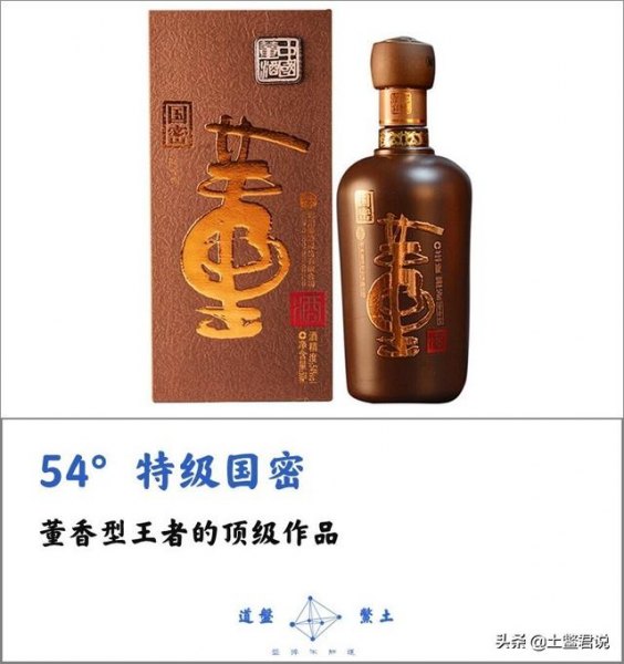 54°董酒特级国密,董香型王者的顶级作品。董香型是白酒香型中极其特殊的一位,它的制曲工艺非常特殊,走的是添加了40味草药的小麦大曲和添加了95味草药的大米小曲双醅串蒸的路数,现在这个配方已经是“国家机密”。所以董香型将大曲、小曲和药曲的特点合而为一,既有大曲酒的浓郁芳香,又有小曲酒的绵柔醇和,还有药曲的清苦舒适,在1963年举行的第二届评酒会上得了个“香艳露骚,味浓丰润”的评价。