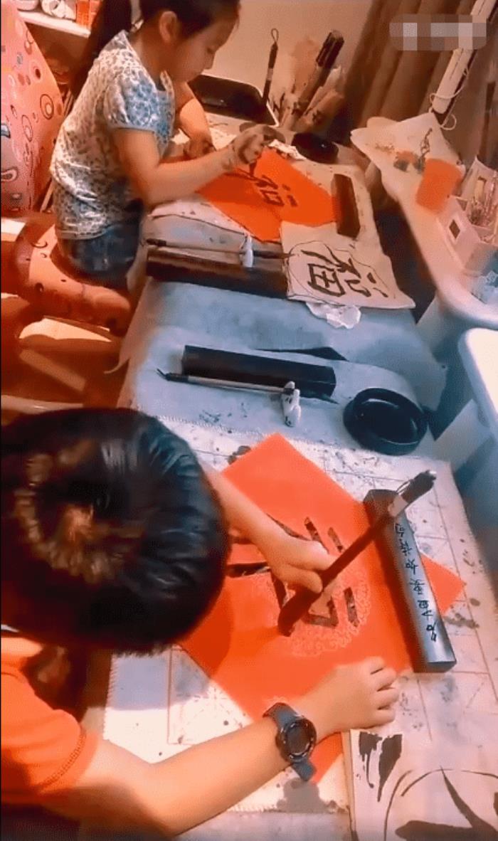 跟女儿相比,儿子王子京是更加像王珂的,跟姐姐一起认真学习的样子真是一副岁月静好的画面。