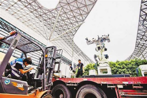 八月二十一日,悦来会展城国博中心,智博会中央展厅工作人员正在将机器人展品搬运进场。记者 龙帆 摄