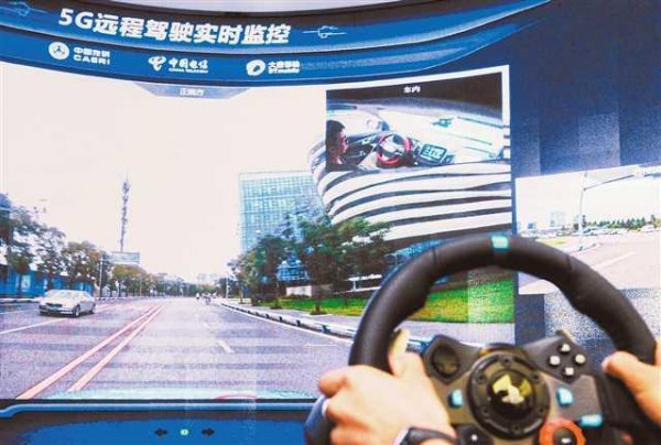 八月十四日,仙桃国际大数据谷体验中心,手握方向盘的驾驶员坐在5G远程驾驶实时监控屏面前,驾驶着行驶在路面的车辆。记者 张锦辉 摄