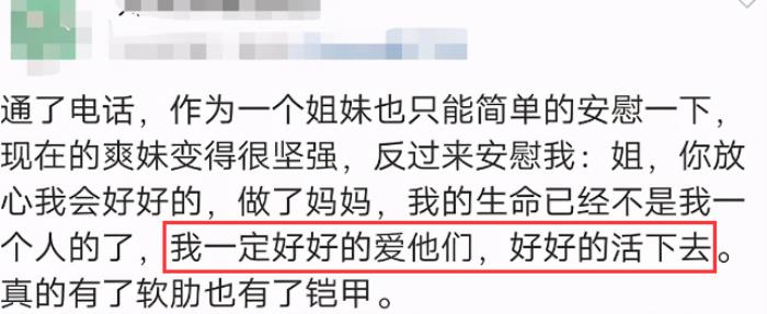 据这位好姐妹叙述,郑爽经历此次劫难后变得“很坚强”,让关心她的人不要担心。自从升级为人母之后,郑爽深刻体会到“有了软肋和铠甲,我的生命已经不是我一个人的了”,为了孩子“我一定会好好地活下去”,疑似向男方妥协、服软。