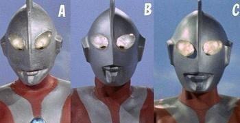 然后又用这个b型脸拍摄了一段时间,据说后来圆谷被入室盗窃了,我不知道是不是真的。然后b型脸就丢了!你这盗窃犯可以的,偷个皮套,也可能是觉得比较新鲜吧。然后圆古就不得不再次制作,就有了c型脸,初代的脸也就基本定型了。