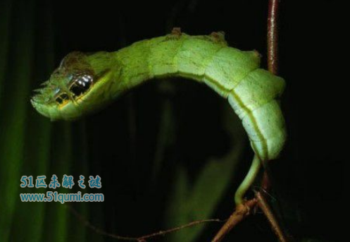 也许它看起来是一条蛇,不过我向你保证那百分之百是一条毛虫,是最奇怪的动物之一。实际上,这种高超的伪装是一种非常独特的自我防卫机能,它可以假装成蝮蛇并以假乱真。当感到有危险时,它就会扬起身体的前半部分,并且像一条蝮蛇一样膨胀起来——这种诡计多端的毛虫甚至会仿效冲刺运动,让对方感觉它随时会发起进攻!