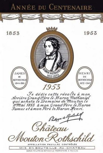 为了纪念购庄一百周年,菲利普·德·罗斯柴尔德男爵决定,将1953年份酒标用来纪念曾祖父。该年份的酒标很特别,它没有选用当代画家的作品,而是直接采用了纳塔涅男爵当年的一幅椭圆形肖像。