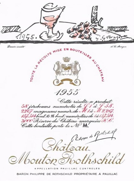 1955 年出自乔治·勃拉克(Georges Braque,1882—1963),他是为木桐酒标作画的第一位大师级别画家,和毕加索同为立体派的创始人。除绘画外,他在雕塑、彩绘玻璃及珠宝设计方面也都非常著名。