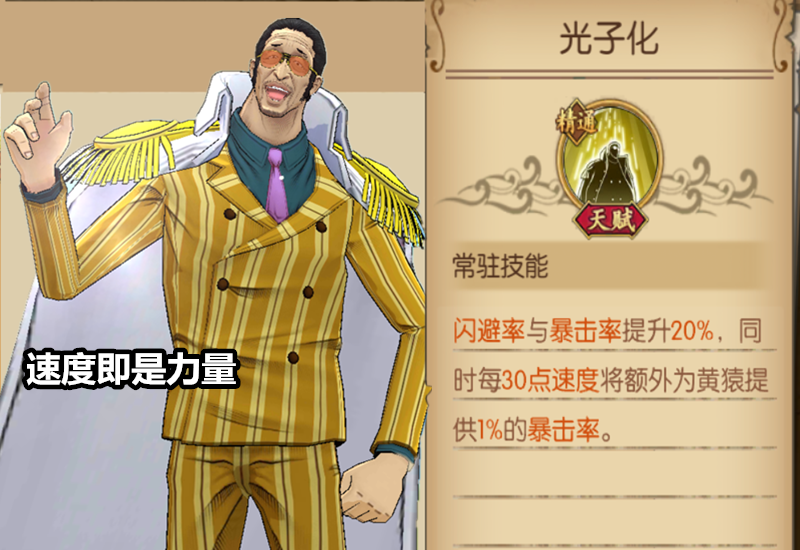 出自黄猿之手将黄猿的闪避与暴击提升20%,同时每30点速度,会为黄猿额外提升1%的暴击率。