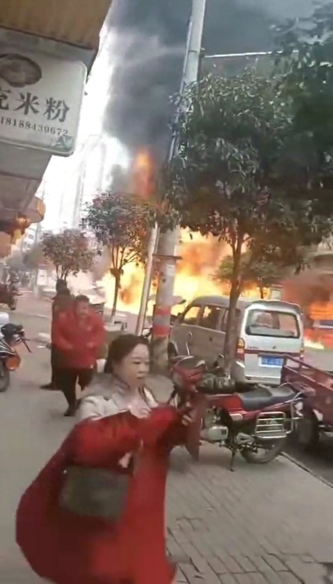 现场视频显示,该起事故发生在一条两边店铺林立且较为狭窄的老旧商业街道,现场火势迅猛,浓烟滚滚且不时传出巨大的爆炸声。附近路人及店内人员纷纷奔跑着撤离事故现场,现场叫声不断并有人喊“着火了,快走!”、“好吓人!”、“火好大哟!”、“几台车子都烂了!”