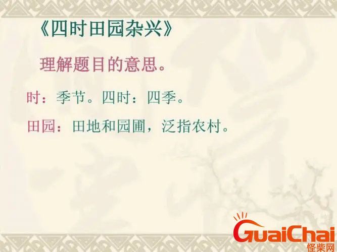 四时指一年四季,田园指农村,杂兴指有感而发的兴致。意思是:诗人看到一年四季不同的田园景色而产生了很多的感想。