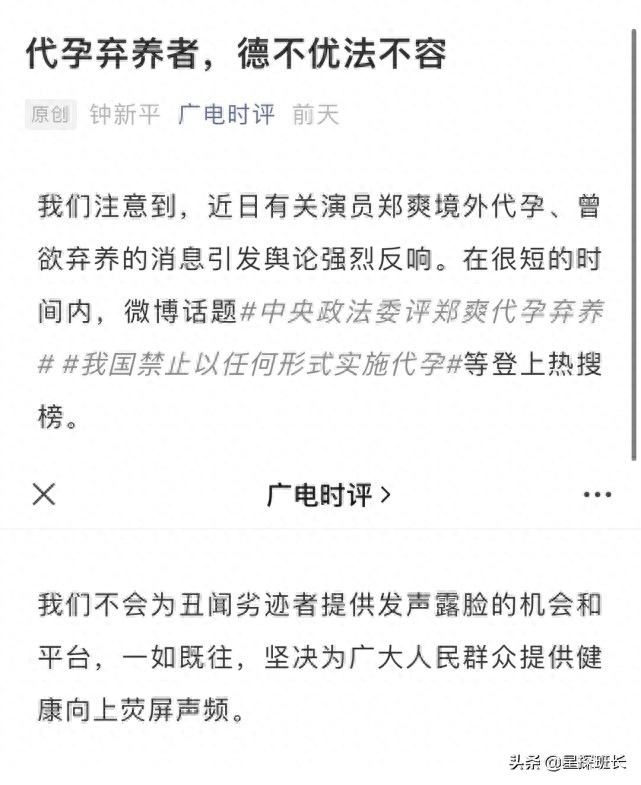 近几日,由于受代孕弃养事件的影响,郑爽成为了最具争议的女明星,而随着舆论的不断发酵,郑爽代孕弃养事件也逐渐演变成了一个社会性事件。而由于其性质恶劣,最终引发了多家官媒发声批评,多个代言品牌也和郑爽撇清了关系,最后广电更是发布了封杀郑爽的文件。