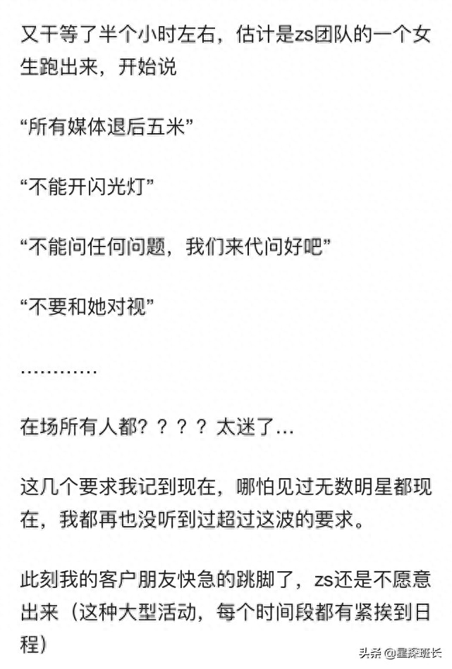 媒体和工作人员等待良久后,郑爽终于打算出来了,但是郑爽团队的一个女生却叮嘱道:“所有媒体退后五米”、“不能开闪光灯”、“不能问任何问题,我们来代问好吧”、“不要和她对视”……