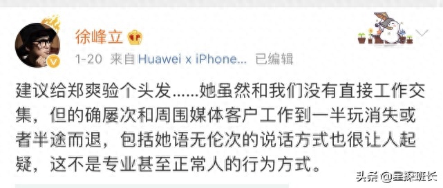 徐峰立表示,郑爽屡次和周围媒体客户工作到一半玩消失或者半途而退,包括她语无伦次的说话方式也很让人起疑,这不是专业甚至正常人的行为方式。