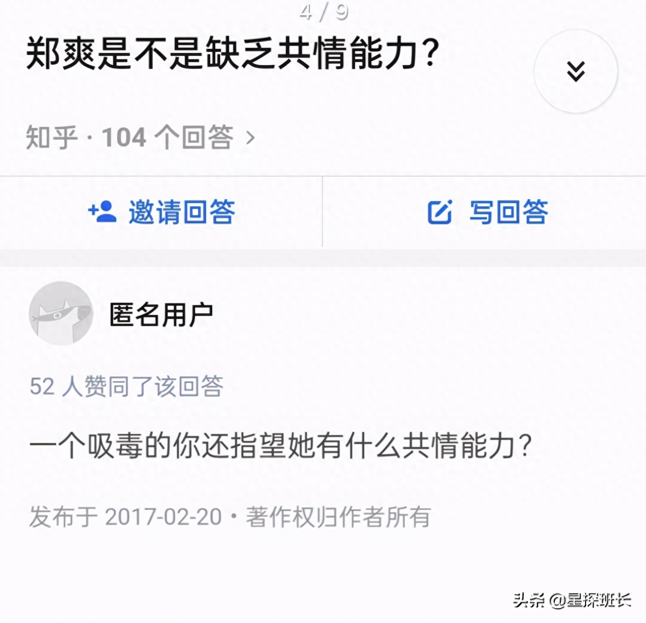 另外,早在2017年时,某问答平台有人提问“郑爽是不是缺乏共情能力”,而有一个匿名回答十分引人注目:一个吸毒的人你还指望她有什么共情能力?