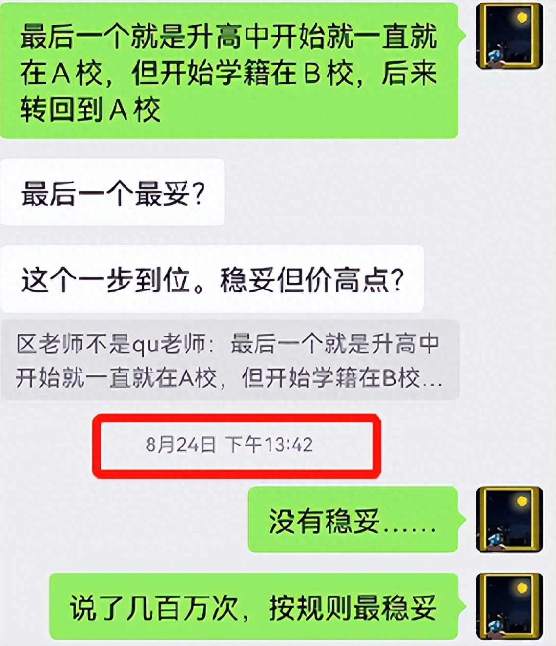 8月24日,还是同样的话题,这个家长再次问我包本校学籍,转学和挂读的区别,我再次强调,没有稳妥。