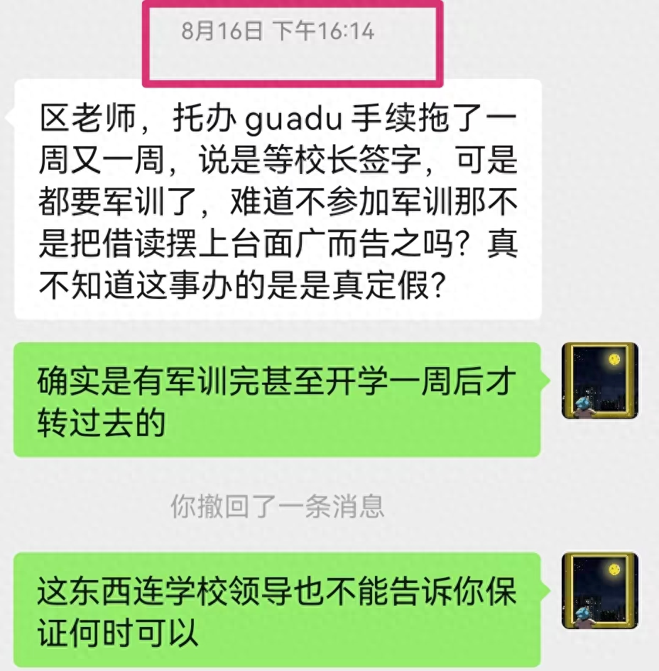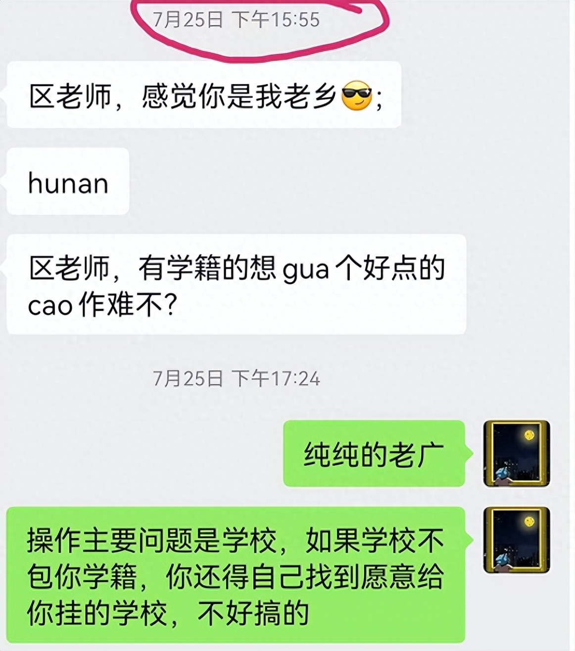7月下旬,包括补录在内的所有录取结束后,这个家长问我挂读的事情。我就按照他的问题回答了一下,也没有放心里。