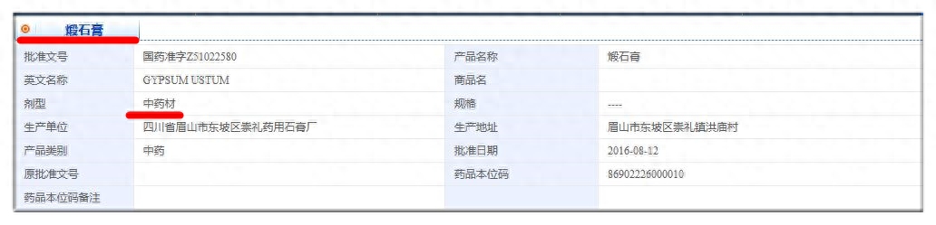 煅石膏,批准文号为国药准字Z51022580,类型是中药材。