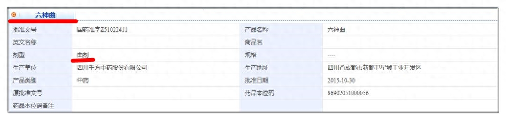 六神曲,批准文号为Z51022411,类型是曲剂。
