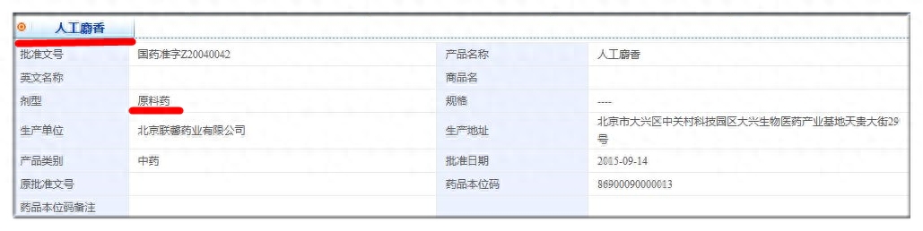 人工麝香,批准文号为国药准字Z20040042,类型是原料药。