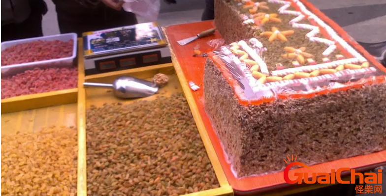 除了糖浆以外,切糕里面有大量的核桃仁、巴旦木、葡萄干、红枣、枸杞等,这些干果类的价格都比较高,因此导致切糕的成本居高不下。