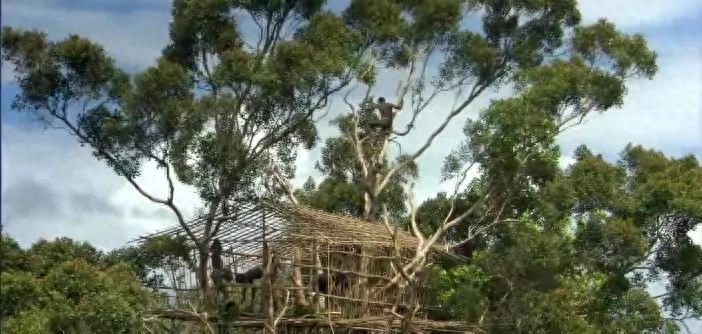 首先在森林里找几颗长得笔直的大树,必须是挨在一起的那种,然后把周围的树全部砍掉,把这些砍掉的树干当做房屋的主体框架,用藤条固定在大树顶端,树皮用来做墙壁,用大型树叶当做房顶,多余的树枝被他们用来做成梯子,固定在树干上。