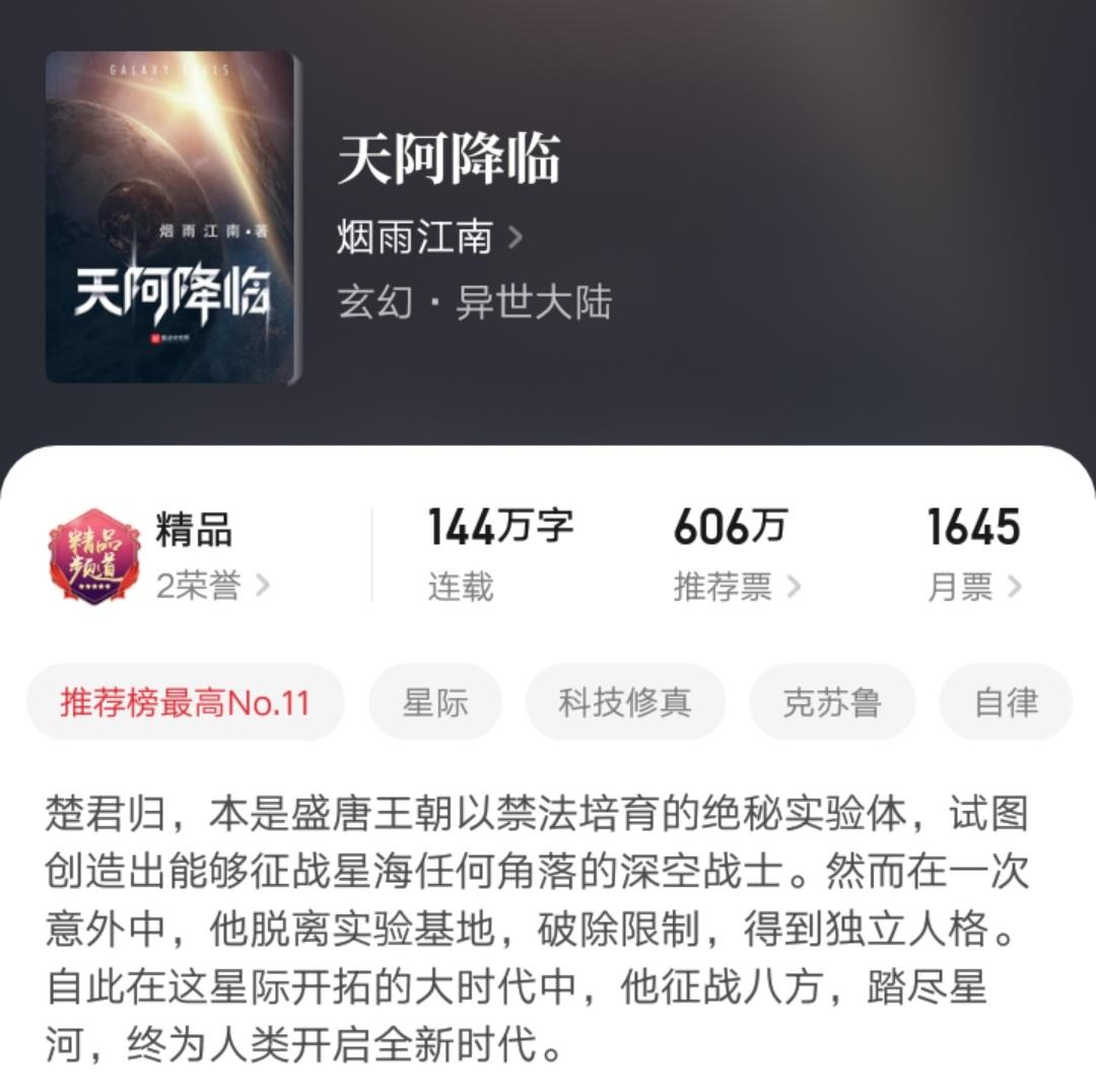 第三本则是目前在连载的《天阿降临》了。我记得开书的时候,烟雨江南说过,他在尝试写新的内容,一本带有科幻性质的小说。只是如今来看,也是不太成功的。