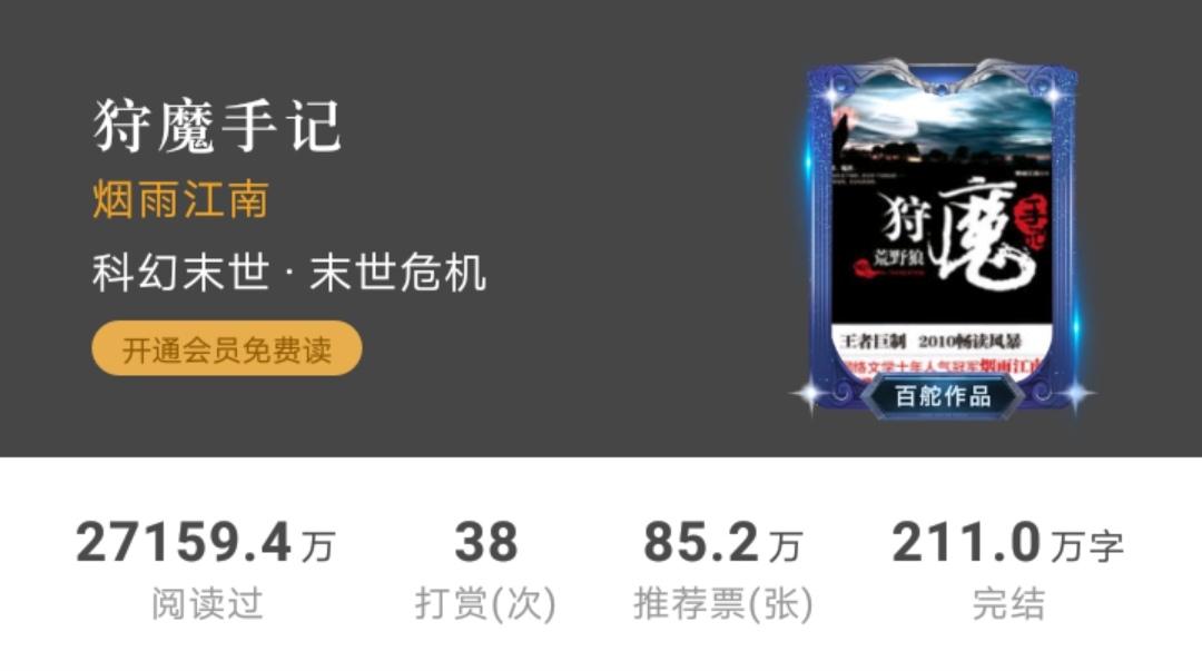 晚上在整理我的起点书架的时候,看见了烟雨江南的小说《天阿降临》的更新。恍惚间想起,我已经好久没关注这本小说的各方面表现了。