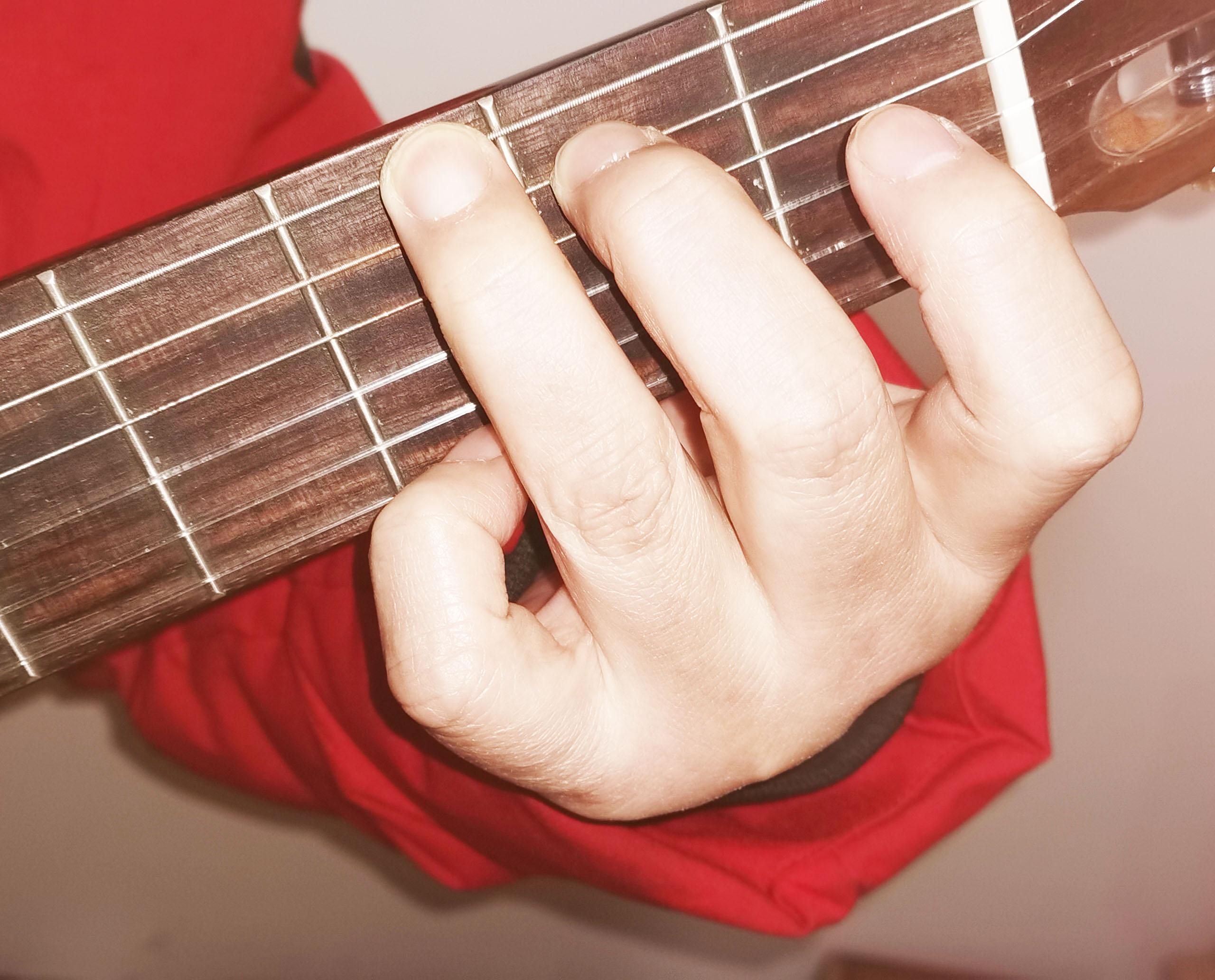 上图2左中食指按住五弦二品,中指按住六弦三品,小指按住一弦三品。