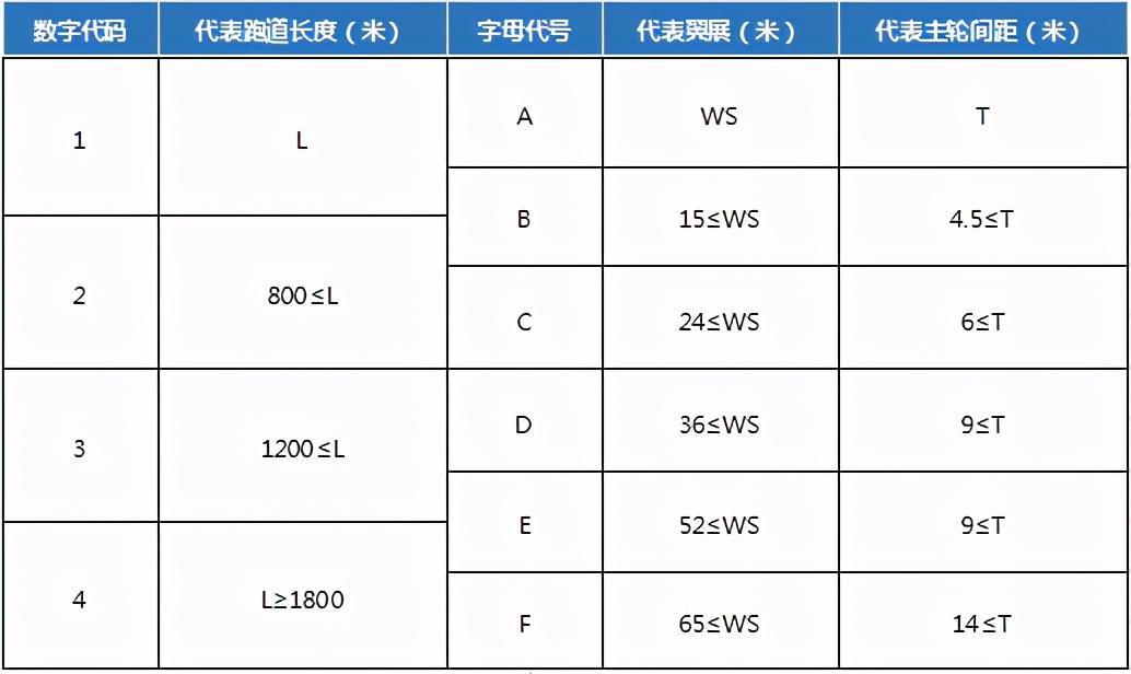 机场的飞行区等级由一个数字和一个拉丁文字母组成,数字只有1、2、3、4,字母从A到F。数字表示飞行场地的长度,数字越大代表跑道越长,可以起降更大的飞机。字母则表示此机场跑道所能允许的飞机主轮间距离(也可以用飞机两个翼尖的距离表示)。有了适当的宽度,飞机在跑道上运动时机轮才不至于越出跑道。字母越靠后,机场跑道的宽度就越大。