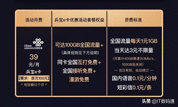 兵宝e卡套餐内包括100GB全国流量,同卡全国互打免费+280分钟国内语音通话。