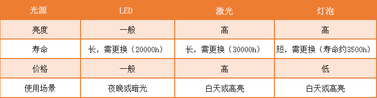 投影仪的投影光源主要分为三种,分别是灯泡、LED和激光。
