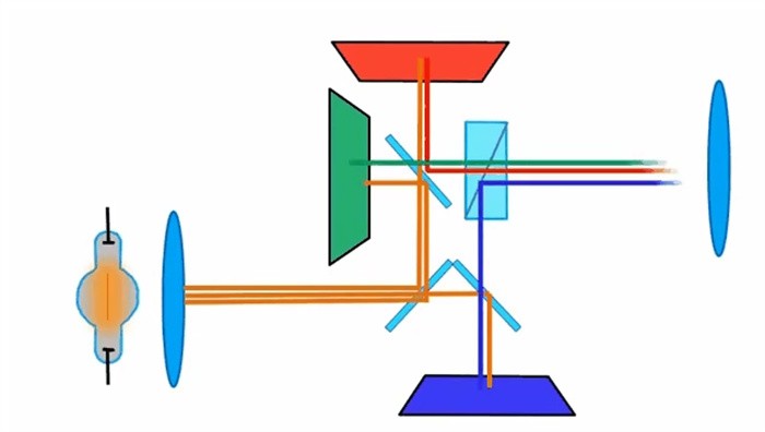 成像原理:将光源发出的白光分成红绿蓝三原色,分别引导到对应的LCD芯片上,再将三个面板的光线通过棱镜使其组合为一个全彩的图像,然后通过镜头放大投射到屏幕上,成像如图所示。