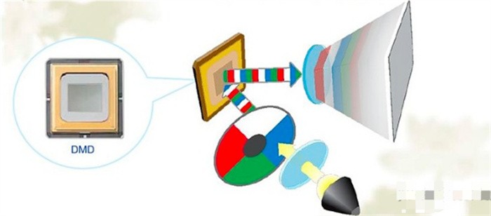 成像原理:将灯泡发射出的强光,经过均匀化处理后通过色轮,色轮会将光分成RGB三色(或者RGBW等更多色),分色后的光线再由透镜投射在DMD芯片上,最后由DMD芯片来完成投影画面动作、色彩的组合,经反射后在投影屏幕上成像。