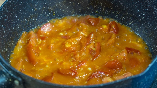 6、起锅热油,下蒜末爆香,把西红柿加进来翻炒,加一勺盐更容易出汁,炒到西红柿完全软烂后加一碗清水盖上煮开;