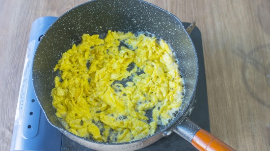 4、起锅热油,倒入蛋液,炒熟后盛出;