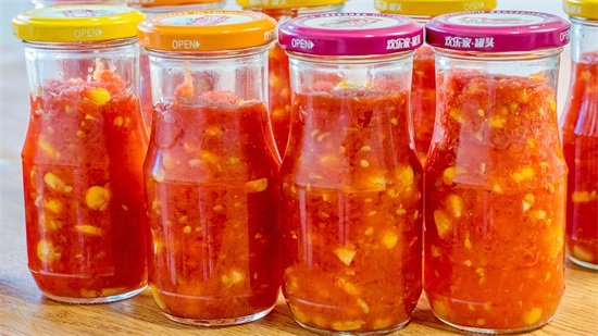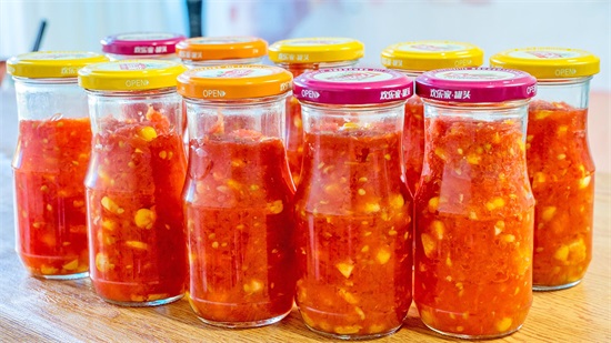 7、拌匀后就可以装进罐子里了,这些小罐子都是平常吃罐头留下来的,今天刚好能用上,这些西红柿我总共装了10罐儿,盖盖子的时候先不要拧紧,轻轻的盖上就行,避免蒸的时候温度过高产生气体,瓶顶爆裂;
