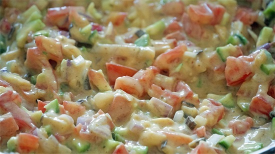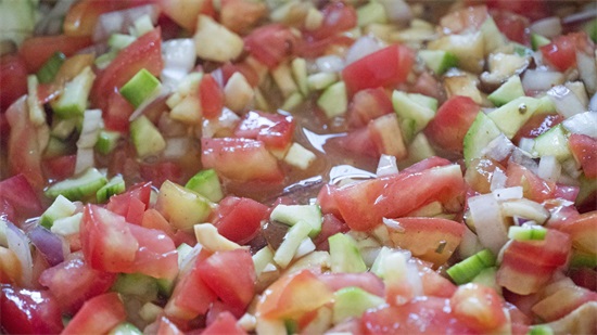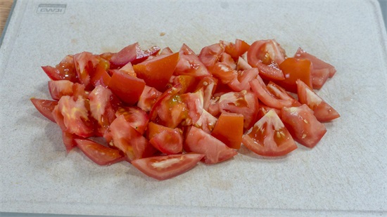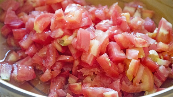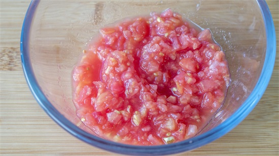 先把里面的汁儿挤出来后再切成小颗粒,加1勺盐腌制20分钟杀出西红柿里面剩余的水份;