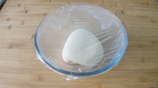 6、现在来做饺子皮部分:中筋粉350克、水120克,揉成一个面团儿后先盖上醒面20分钟;再来揉面你会发现很容易揉光滑,继续醒面1个小时;