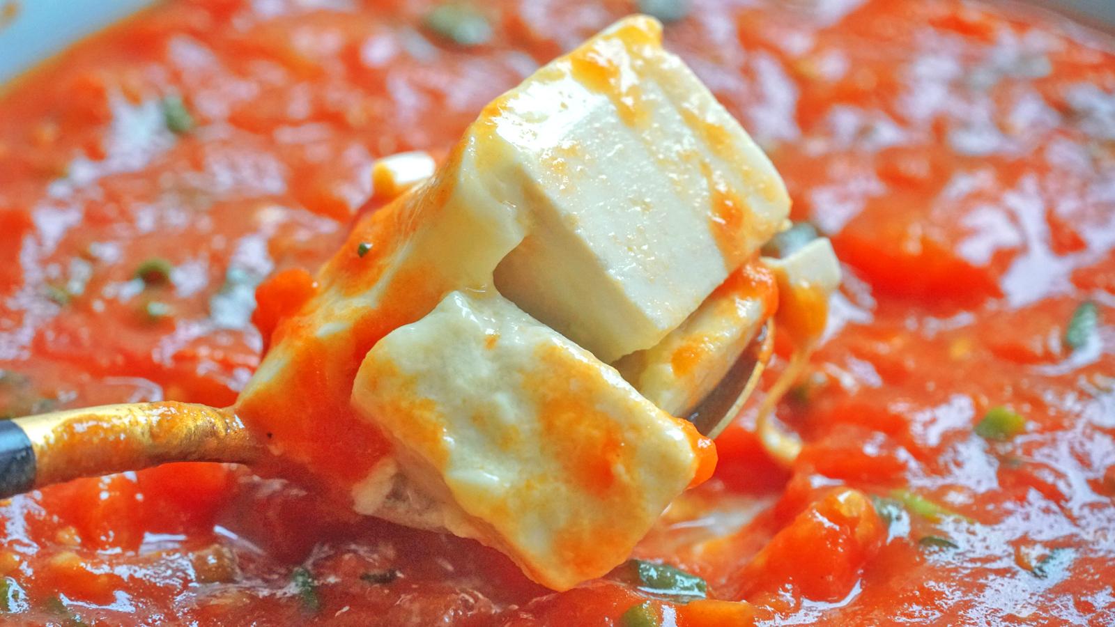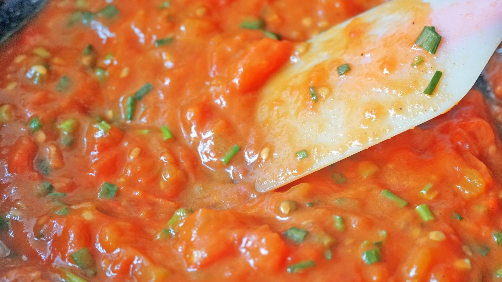7、我们刚好用蒸豆腐羹的时间来炒番茄酱,锅里加点油,不用太多,油热了就把西红柿倒进去,多炒一会儿,等到它完全地炒出了汤汁后再来调味,一勺生抽、半勺蚝油、一点点的胡椒粉,小火慢慢的炒,炒成浓浓的番茄酱就可以了,出锅前再来点葱花;