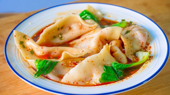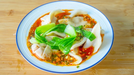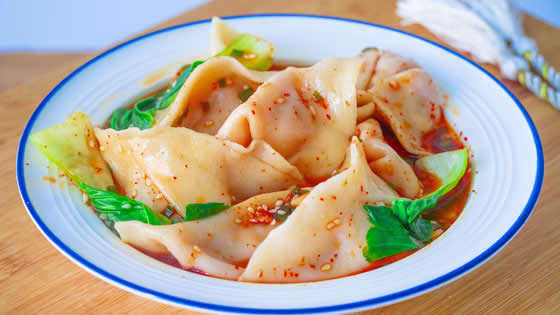 10、浇上调好的料汁,热腾腾的饺子汤,再来点青菜,解馋开胃的酸汤水饺就可以开吃了;