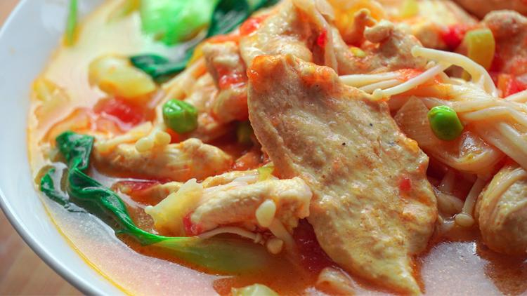 西红柿、鸡脯肉、1个蛋清、大葱、上海青、金针菇、青豆