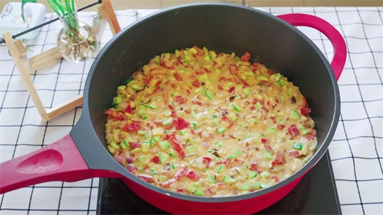 4、平底锅倒油,油热之后倒入面糊,用锅铲摊平,表面撒少许食用油,盖上盖子焖3分钟;
