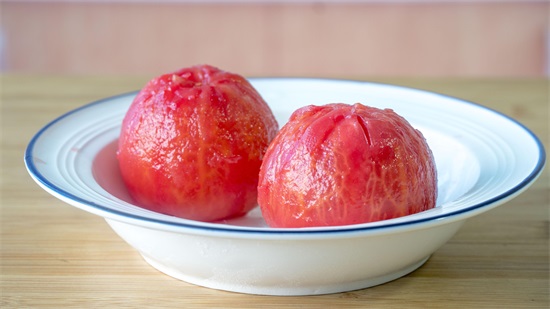 2、西红柿2个(约重300克),划十字口加开水烫几分钟,去皮后切块儿;