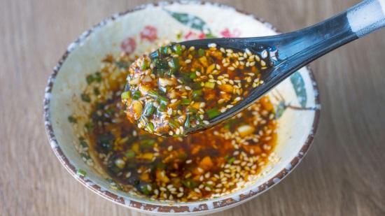 8、起锅烧水,这个时间我们来做一个汤料:蒜末、白芝麻、辣椒油、葱花、热油,趁热浇上生抽、香醋、盐、白糖,香味儿瞬间激发;