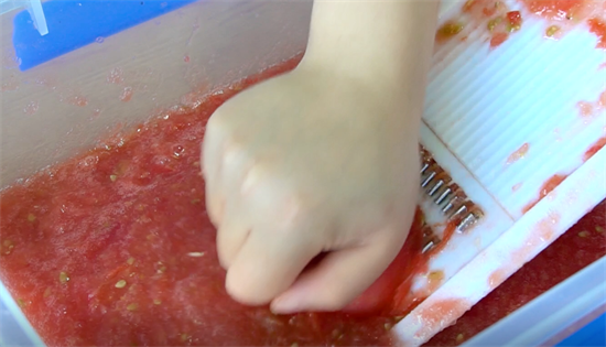 5、西红柿表面的水份完全晾干以后我们就可以开始操作了,刨子和擦丝器都行,把每一个西红柿擦碎,用刀切的话就还要先去皮,然后切小块儿后剁碎,这个方法呢就更简单一些;